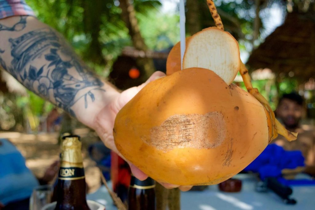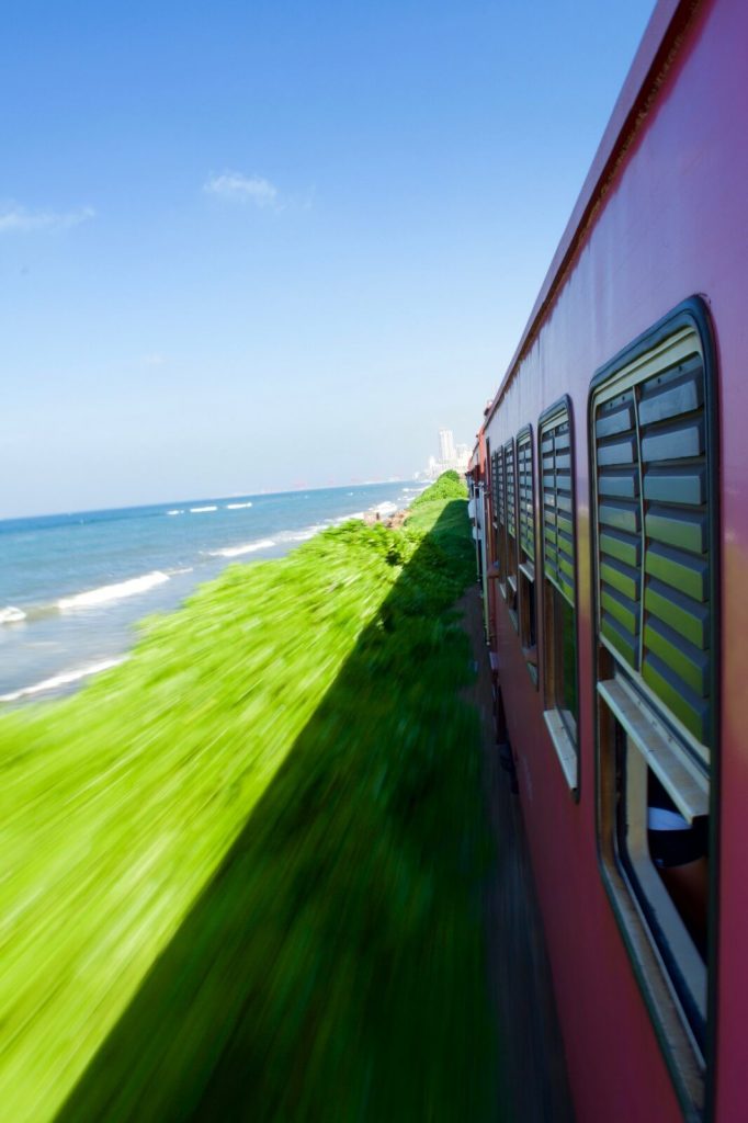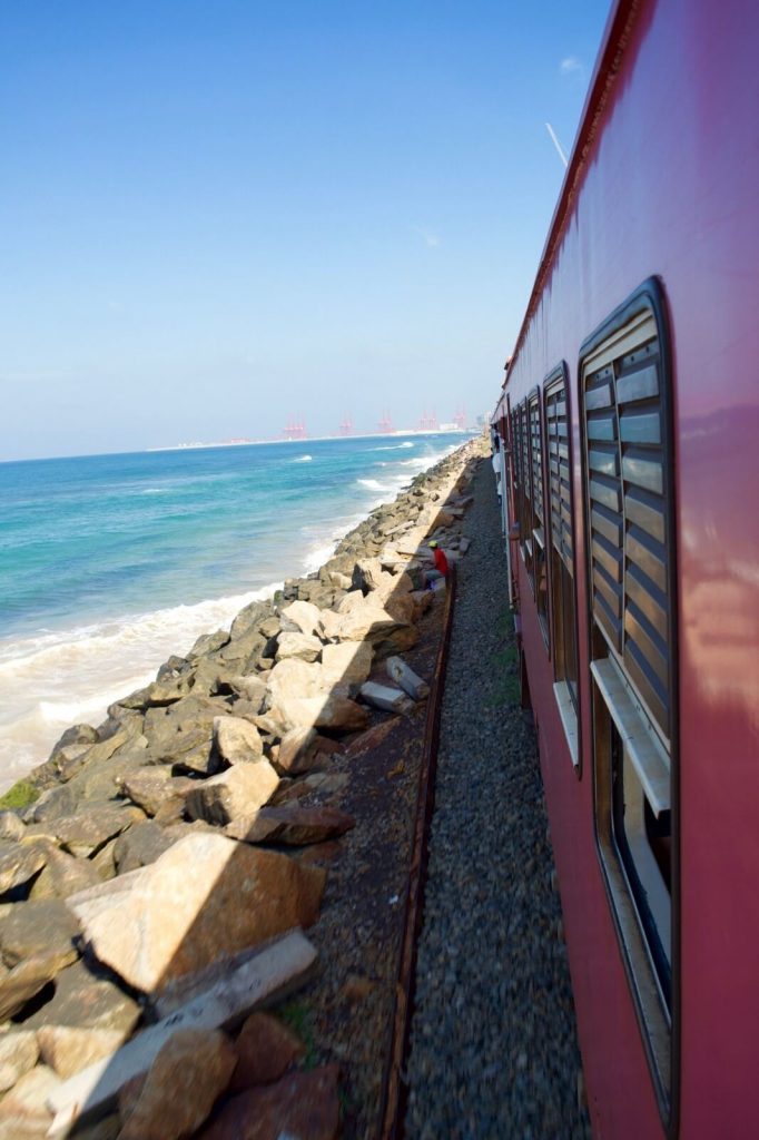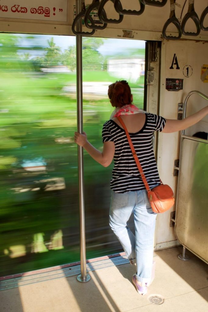 The train ride from Colombo to Bentota was hands-down one of the most incredible travel experiences of the entire trip. This rugged, decades-old train hugs the coastline so closely you feel like you’re gliding over water. The doors stay wide open the entire time – no safety protocols, no warnings, just trust that you’ll hold on tight. I spent most of the journey leaning out, camera in hand, trying to capture that feeling of almost flying over the Indian Ocean (Michele stayed safely inside).