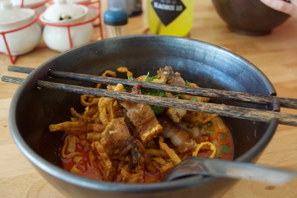 In the shocker of the century, we also craved khao soi. So, the next day, we went to a little hipster place in Nimman (think exposed brick and baby cacti) to satisfy our yearning. Shiv had to turn in to do some work on the contracting project he’s finishing up, so that afforded me some time to shop and catch up with my Thai friends at Roll Me, the roll cake dessert shop. I stopped in to say hi to June, Tina, and Nana (not their Thai names obviously, but what they go by). We practiced English and Thai, and I gobbled down another roll cake. June learned how to make pastries in Japan, so many of the cuter-than-cute designs are inspired by her time there. She also studied in Canada, so her English is very good. In addition to giving my thighs some girth, she’s also been helpful with information about the happenings in the city.