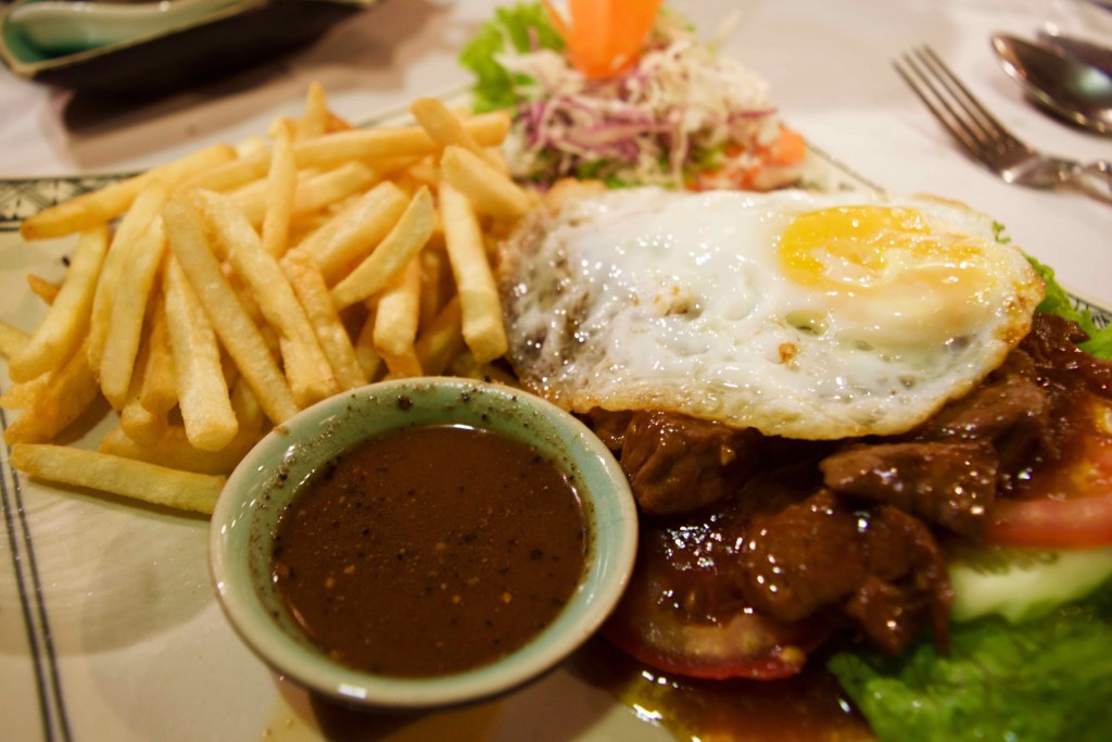 The next day was an exploration day. Shiv and I have carved out a little tradition of allowing ourselves on the first day of travel in a new city to just simply explore the city – no tours, no commitments – just seeing where the day takes us. In that day’s exploration, besides fending off hey lady, tuk tuk? calls every 2 minutes, we found ourselves trying traditional Khmer cuisine at Mahob Khmer for lunch and then at Café Indochine for dinner. We sampled two traditional Cambodian dishes: fish amok, a curry soup, and beef lok lak. Shiv and I found Cambodian flavors to be subtle, yet delicious.