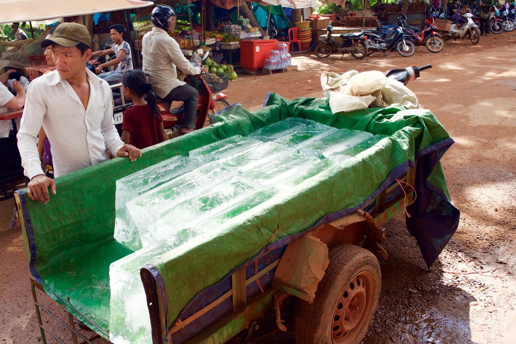 Our first stop was the Rolous Market, the local market for the village. Cambodia has the largest lake in all of Southeast Asia, the Tonlé Sap, so a lot of their cuisine is fish-based. And where do you buy the fish? At the market of course! We saw vendor after vendor with those round, pastel-colored plastic oil drop pans full of squirming fish. Many of the women were busily scraping scales off the fish, so you’d see shimmering mountains of discarded scales everywhere. Bright red chilis were nestled between peeping baby ducks, adjacent to 5-gallon buckets full of wiggly tapioca jelly. Women would saunter from vendor to vendor picking out the day’s groceries. We even saw the ice delivery guys cutting up huge blocks of ice for the market.
