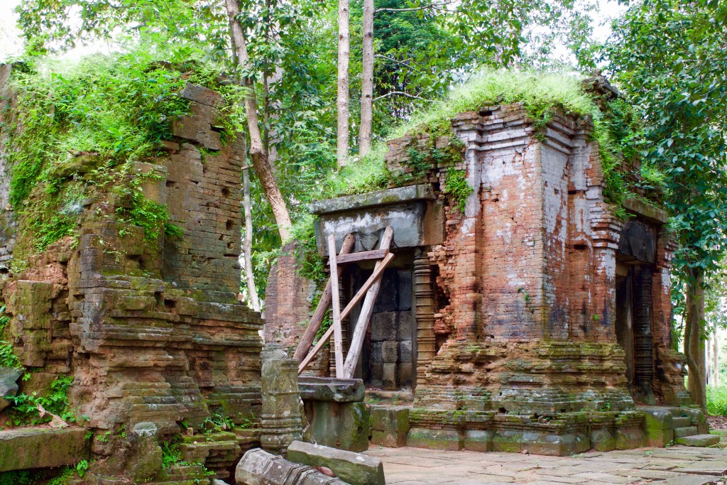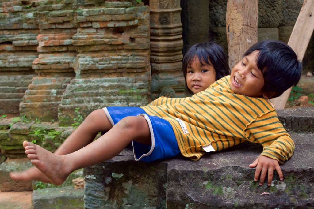 After the market, we headed out to see the Preah Ko temple ruins. This temple, the first to be built in the ancient city of Hariharalaya (now Rolous), was built in 879 by Khmer King Indravarman I. As we headed over there on our bikes, a swarm of giddy village kids hitched rides on the backs of our bikes to the temple – which now serves as their own jungle gym. As we explored the ruins, the kids would grab our hands and want to play.