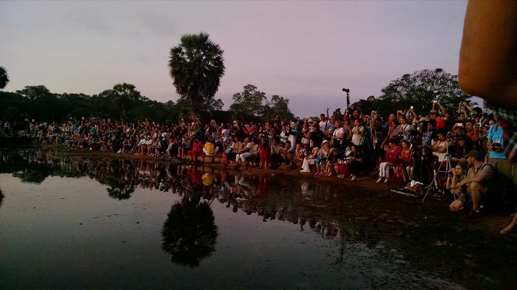 As we entered the area, we could already see hordes of people setting up (see picture proof above). When we came to our predetermined area, we found that it was empty! Perhaps Vishnu was smiling upon us? Not only that, but a lady selling coffee offered us her small plastic chairs for $1 to rent. Best investment ever! We set up shop, Shiv with the camera, me with the GoPro, in that perfect, little area. All while sitting comfortably in our chairs. Let me tell you, it got very heated with the crowd. I saw people pushing and shoving and carrying on arguments. If you venture for a sunrise at Angkor Wat, be forewarned.
