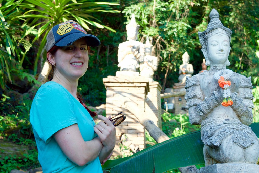 The hike was relatively easy for the first twenty or thirty minutes. At around that time, we happened upon Wat Pha Lat, which is another temple along the route. Smaller in size, it’s nestled right next to a wide, but shallow river stream with lots of large rocks that allow you to hop over to the other side. It also has a cave with many old Buddha statues. We stopped to enjoy the quiet peacefulness the place offered, as well as the cooler temperature.