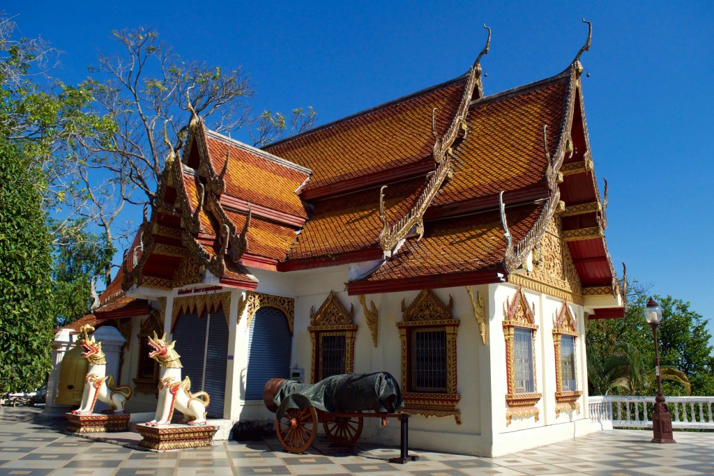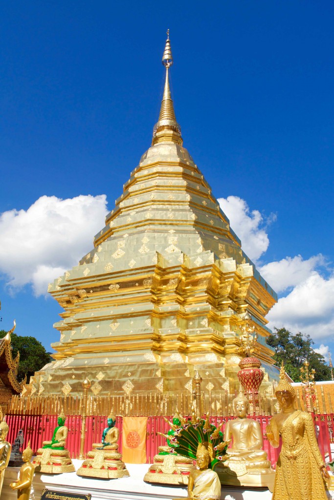 It’s four miles uphill from Wat Pha Lat to Wat Phrathat, or about 2 hours. Once we arrived at Wat Phrathat, we discovered that we had another 309 steps up the stairs in order to enter! On either side of the stairs were these exquisitely maintained and very colorful ceramic dragon guardians creating one of the grandest entrances to a wat we’ve ever seen (and by this point in time, we’d seen a lot of wats!)
